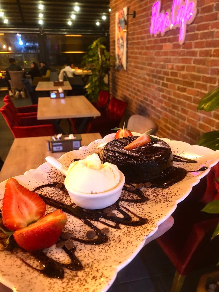 Tereyağlı kakaolu kek, bitter çikolatalı ganaj...